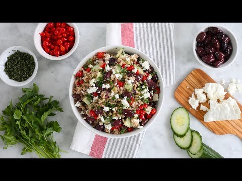 Trade in your leafy greens for these protein-packed grains! This Greek-style farro salad features plump, purple Calamata olives and our sweet-and-tangy Pepper Drops, along with feta and other fresh favorites.